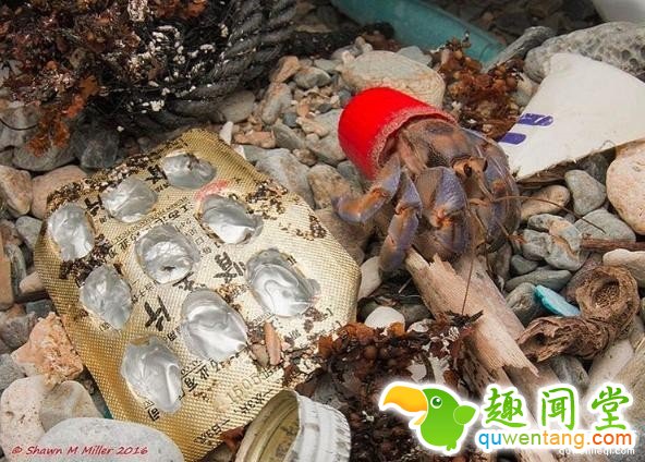 当摄影师Shawn Miller2010年造访冲绳的时候,在美丽的海边看到背着塑料瓶盖的寄居蟹,内心的震惊实在难以形容。