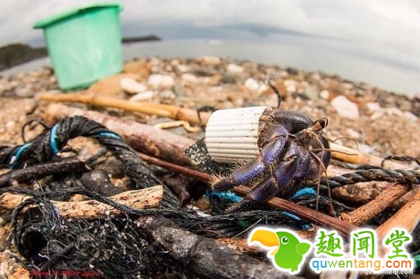 据估计,每年有40亿磅的垃圾在海上漂流,被寄居蟹拿来当作家还算是干扰最小的,更多动物被垃圾噎死,性命受到严重威胁。