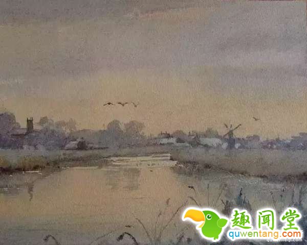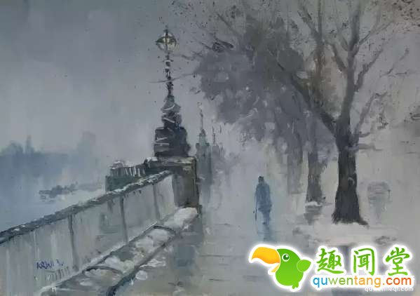 Kieron的画不同于其他同龄人的作品,他不喜欢用浓烈的色彩,也不喜欢对比鲜明的构图。事实上,无论是笔触还是选景,都让人深觉Kieron有超乎他年龄的成熟——灰黄色的天、蓝色的人、浅棕色的房子和黑白色的飞鸟,浅淡却不失层次。
