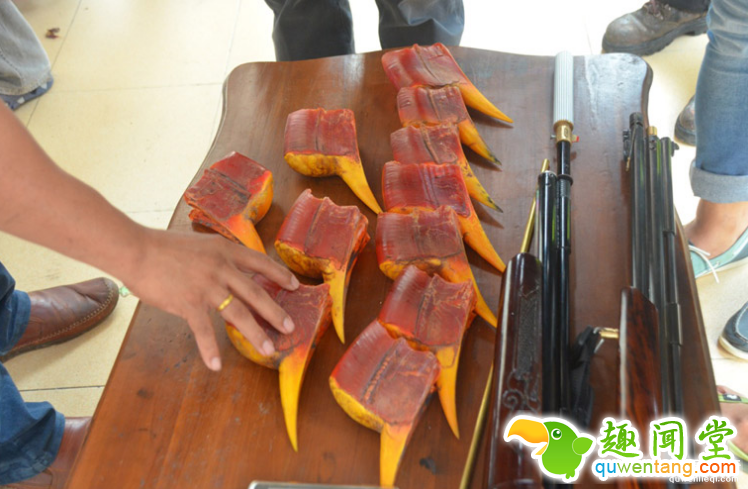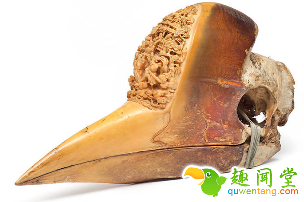 更令人唏嘘的是这些原材料是来自濒临绝种的盔犀鸟身上!这种鸟类的头骨的样子像头盔,且它们的头胄部分是实心的,这使得它们的头部成为了上好的雕刻材料。