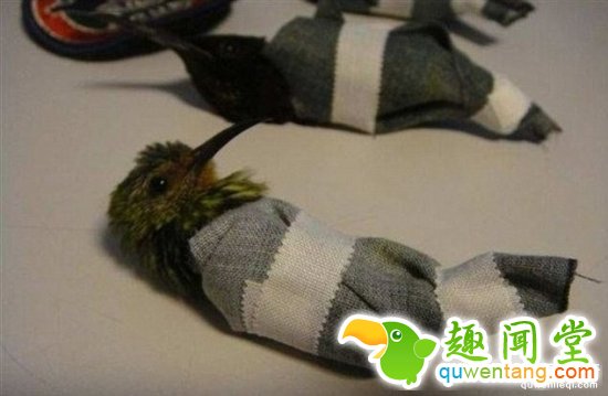 为了防止蜂鸟在裤裆内活动和鸣叫,该男子给这些蜂鸟注射了镇静剂,还特地用一块布把蜂鸟全身包裹地紧紧的,让它们动弹不得。