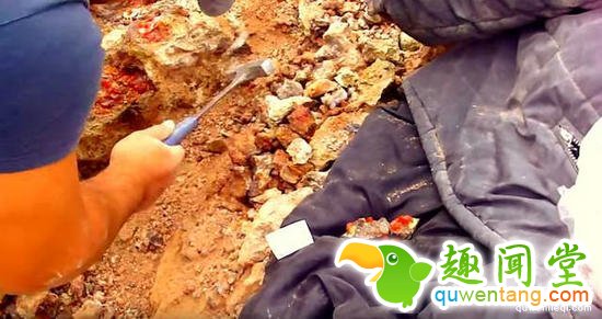 一男子拿着一个小铁镐在一个乱石堆里挖东西。最终他们挖出的东西打破了世界纪录。此刻他们正拿着小锤敲敲打打,谁也不知道下一步会出现什么奇迹。