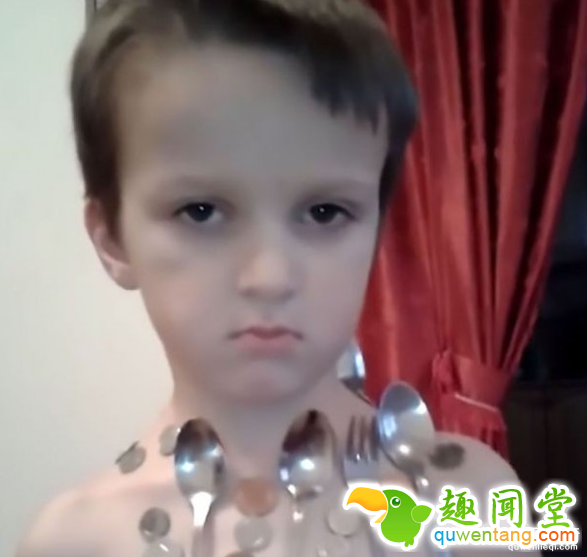 外国5岁小男孩Erman Delic有一天看电视的时候突然发现勺子能吸在身上不掉,换成叉子一试也能吸住,又换成硬币一试还能吸住。