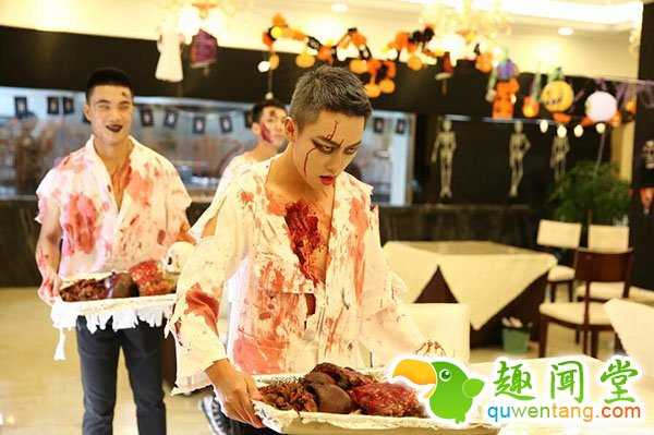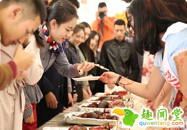 最夸张的是,该学院食堂推出了应景的节日大餐——恐怖黑暗料理“人体”大餐,什么“人眼”泡汤、麻辣“人脑”……各种逼真而极恐“大餐”将恐怖黑暗料理推到了极致。