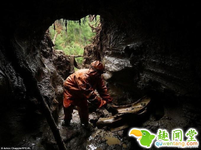 尽管象牙价格高昂,但在极度严寒的西伯利亚冻土带工作可不是一件轻松的事。这些猎人不光要忍受艰苦的环境,还需要时刻防备野兽的攻击。但随着象牙市场的繁盛,已经有数百名当地人加入到了这项非法挖掘活动中。图为猎人走进地下洞穴,寻找猛犸象遗骸。