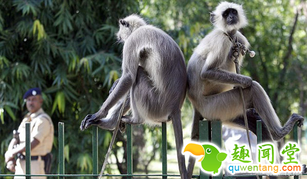 在印度城市阿格拉,迫于被小猴子骚扰的无奈,越来越多的新娘雇用大猴子及其主人当保安,以阻止烦人的小猴子到婚礼现场骚扰。真想不到猴子也能当保安啊!