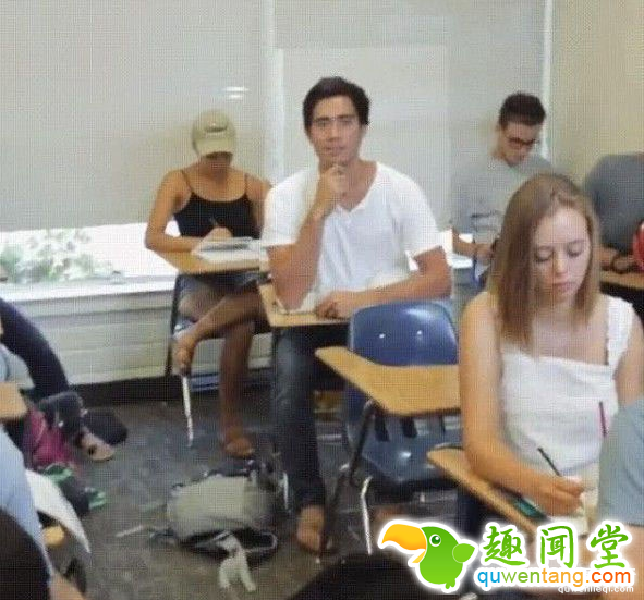 现在的学生为了上课能睡会觉想出各种办法,下面这个学生的方法看着还比较安全,他趴桌子上睡觉,前面用一个自己正常坐姿拍下来弄成一幅大的照片,看似很正常,只要老师从旁边一看就露馅了。如果老师在讲台不走动是没问题的!