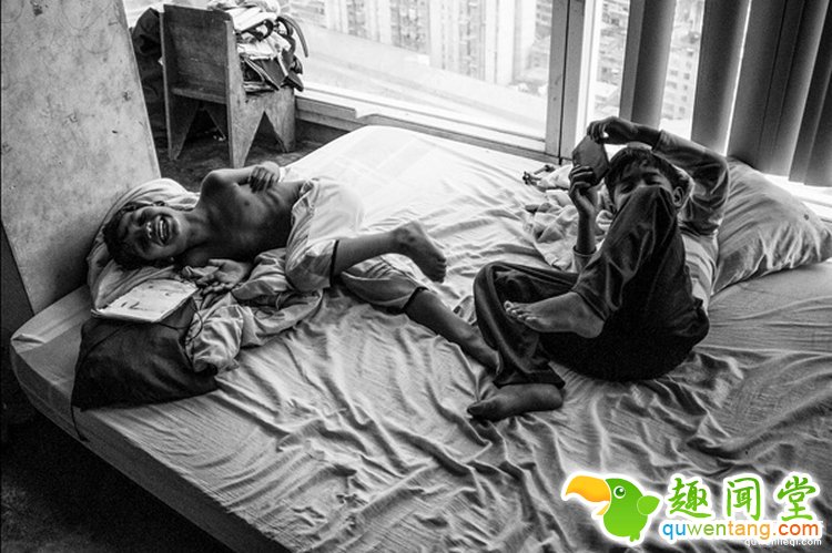 这里很多都是以家庭为单位居住在这里的,图为ting和tong两兄弟在床上玩耍,从他们的表情中可以看出来,这样的环境对于他们来说已经很好了。