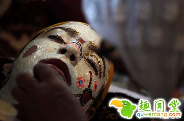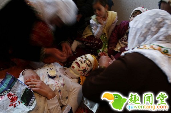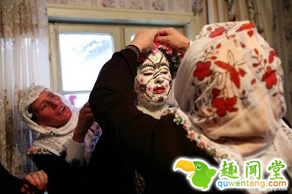 在保加利亚西部的里布诺沃村有种传统习俗,婚礼当天,新娘要化“僵尸妆”。脸上涂满白色涂料,用鲜艳的口红上色,亮片点缀。据说是以前的新郎从未见过新娘,老一辈的人就把新娘脸上贴满“障碍物”让新郎慢慢清理,学会温柔对待新娘。