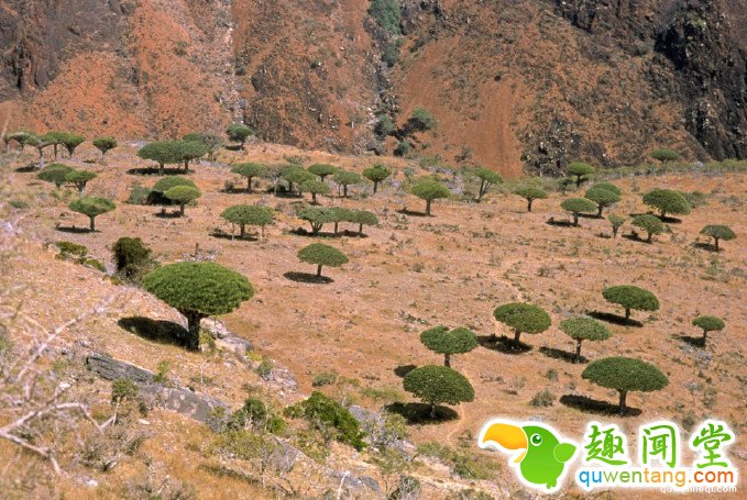 索科特拉岛颠覆了人们脑海中所有对“正常”景色的印象,岛屿景象仿佛来自另一个星球或者来自地球远古及未来的某个时期。岛上的人口将近44000人,因为长期远离大陆,很多居民的遗传谱系在世界上绝无仅有。图为岛上成片的龙血树。