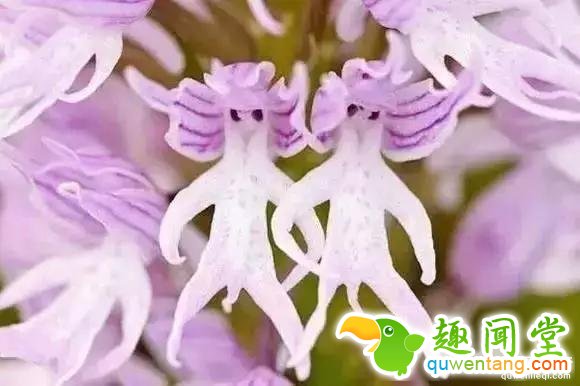 也称裸男兰、意大利男人兰,为兰科红门兰属的一种,植株高20-50厘米,花顶生,为发白的粉红色或紫色,花被片为头盔状,有暗色条纹,整朵花的造型就像一个戴着草帽的裸体男人。