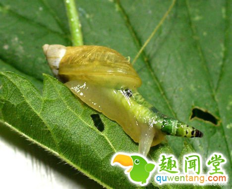 双盘吸虫,图中蜗牛身体上有一部分可能会被许多人误认为是蜗牛的触角,其实这根本不是触角,而是一种双盘吸虫。这种寄生虫可以进入蜗牛的消化系统,并长成一条长长的管,其中充满了数百只有生死能力的尾蚴。
