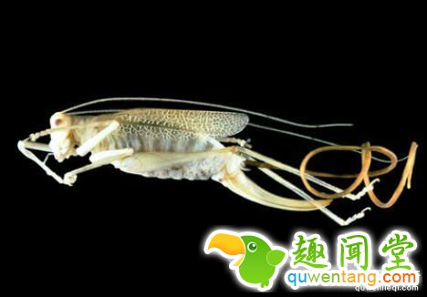 金线虫,感染金线虫的蟋蟀和蝗虫会产生一种求死的愿望。这种寄生虫常常在水中形成幼虫,然后在蟋蟀或蝗虫体内长大成熟,长度可达宿主体长的三到四倍。一旦成熟后,金线虫就会将蝗虫变成僵尸,并驱使它们自动投入水中后淹亡。