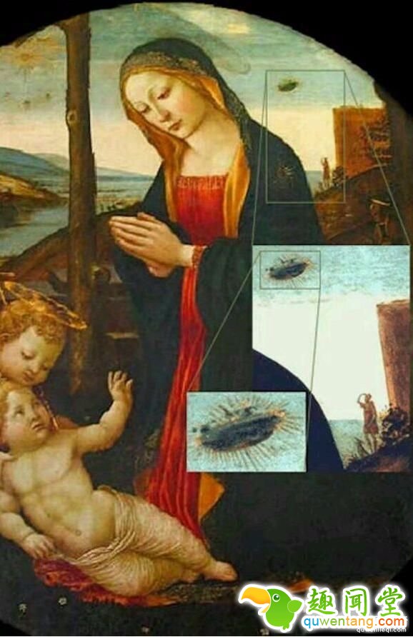 这张画像的重点当然是中间的圣母玛莉亚,但是如果仔细看就能看到她的左肩上有一个不明物体,放大后的影像看起来似乎有点像UFO,而左后方也能看到一名男子以及他的狗正抬头看着这个盘状物体。