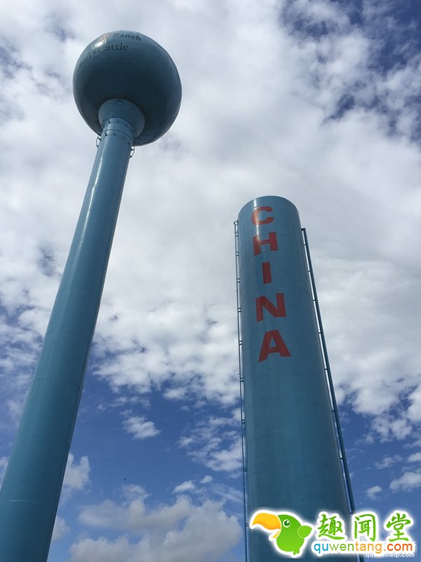 中国市的两座蓝色水塔拔地耸立,一高一低,形同火箭发射台,上书红色大字“China”。