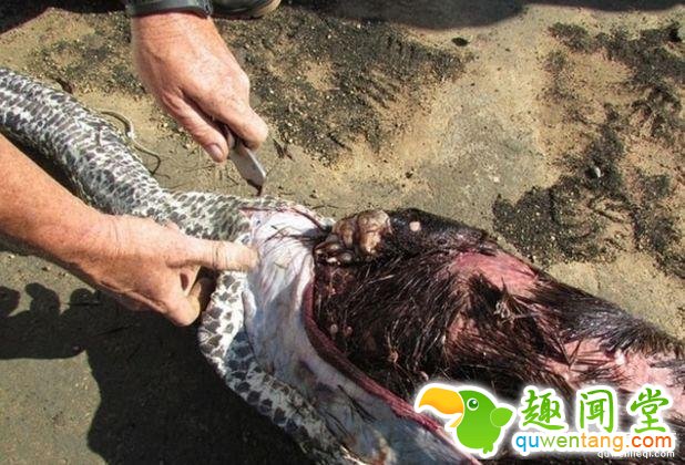 5米长的巨蟒吞下豪猪,吞下没多久被刺扎死