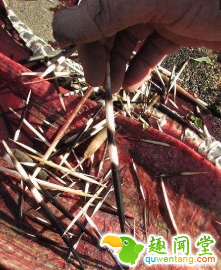 再看看蟒蛇的腹中,全都扎满了豪猪的刺,要知道豪猪身上的刺是非常坚硬的。这蟒蛇也真是的,吃什么不好,非要吃豪猪,它吃的时候就不扎嘴吗?真是太笨了,搞得最后自己也丢了性命。