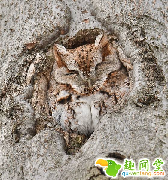 这只猫头鹰显然不想被打扰,它挑选了一个完美的地方小睡——将自己伪装在了一棵树的树洞中。听到快门声后,它睁开了一只眼睛,看了一眼摄影师,然后又合上了眼睛,接着睡。安德烈说,它伪装得很好,大约在一棵25英尺(约7.6米)高的树上,我一开始都没有发现它。被惊醒了后,它看起来有些恼火