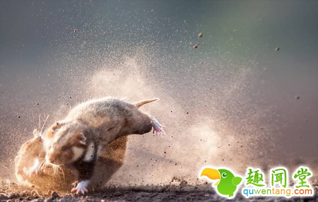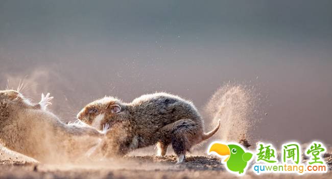 照片中,两只仓鼠同时跳起撕咬对方,伴随着激战时扬起的尘土,一场争抢者占领上风的搏斗最终以其中一只小仓鼠的败北而结束。