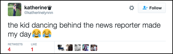近日,美国WAFB电视台(美国哥伦比亚广播公司CBS附属电视台,驻路易斯安那州首府巴吞鲁日——观察者网注)记者在洪灾现场进行报道时,一个熊孩子躲在记者背后,以一段“精湛”的即兴舞蹈实力抢镜。