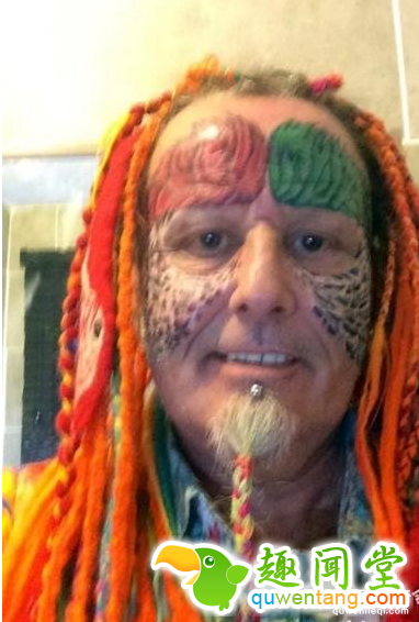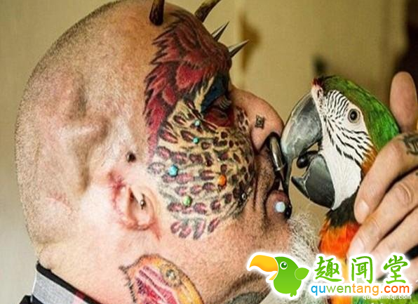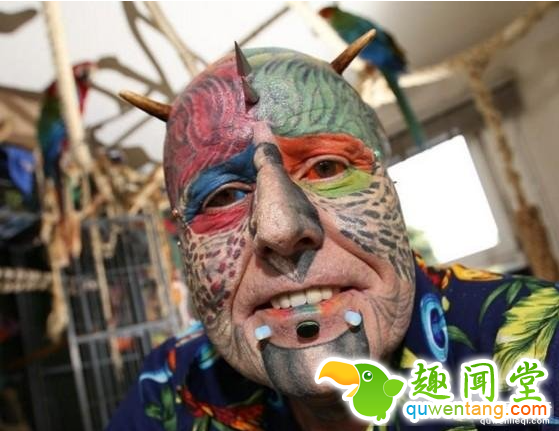 除了整容,Ted Richards还在自己的头部、手臂等位置做了大量的鹦鹉纹身,还在自己的额头植入了钛合金,鼻子和脸部还有各种穿刺,看着都让人觉得疼。