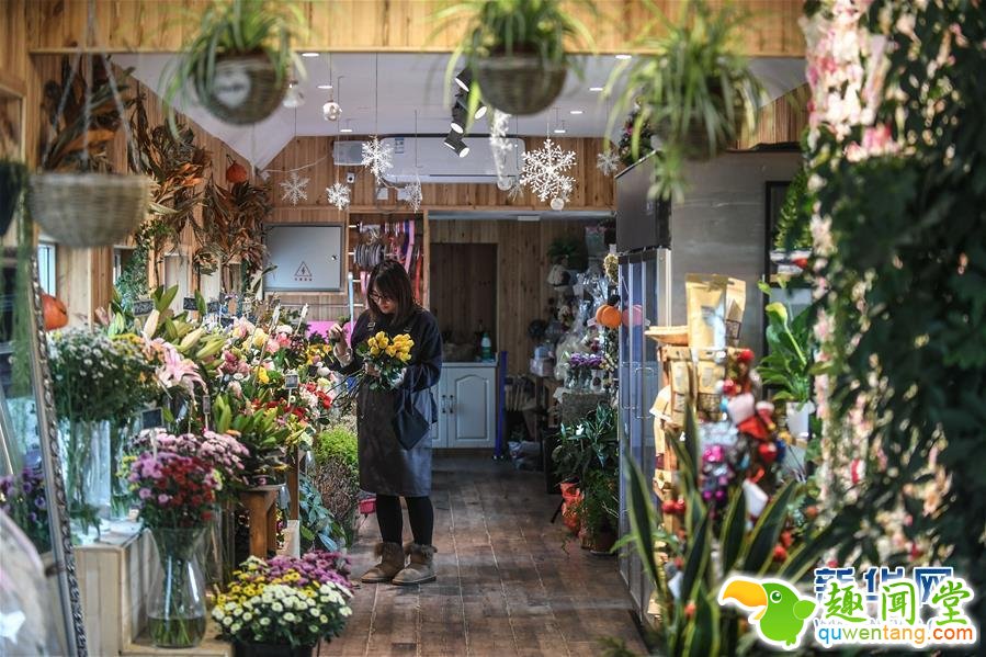 12月22日,大连双创火车小镇一名员工在创意花店内工作。辽宁省大连市将淘汰的绿皮火车进行改造,打造集文创、商业为一体的青年创业创意社区,建成占地2万平方米的双创火车小镇,共有20节绿皮火车车厢。目前有社区便利店、创意花坊、连锁简餐等创业项目入驻创意小镇。新华社记者 潘昱龙 摄
