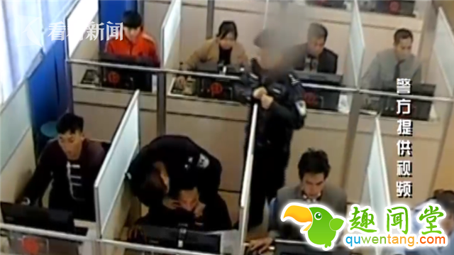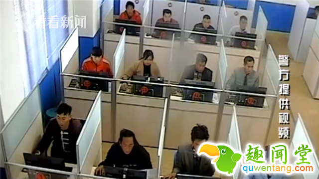 从画面中可以看到考场中有众多考试在认真的进行着驾照科目一的考试。可就在民警对考场进行巡视时,考场中最前排身穿黑色上衣的男考生引起了民警的注意。
