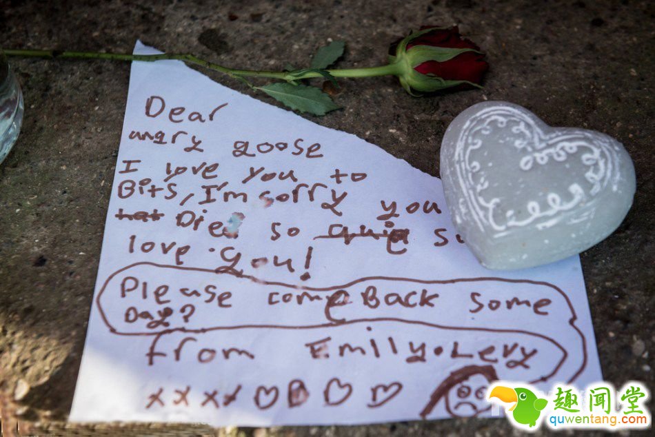 可是,21日那天,一些村民发现这只鹅被一名驾驶四轮驱动汽车的男子用气枪射中头部而亡,全村人都伤心、愤怒不已,纷纷前往“鹅”的家——一个红色电话亭,献上鲜花表示哀悼,孩子们还写了卡片,表达对“鹅”的爱和思念。
