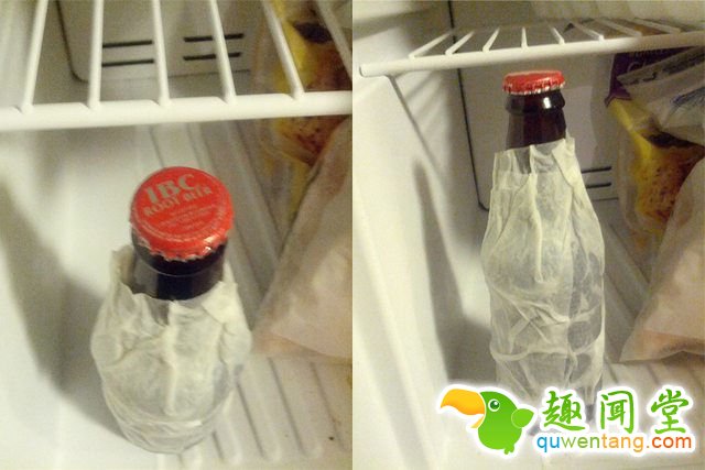 13. 纸巾除了清洁,还可以帮助降温:把它浸湿,然后裹在饮料瓶上,冰冻 15 分钟,就能得到透心凉的饮料了。