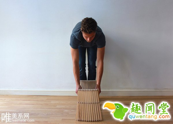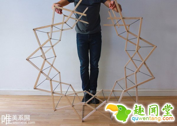 设计师 Aaron Dunkerten 打造的折叠式晾衣架,由几十条木板组成并以铝合金金属棒连接加固。