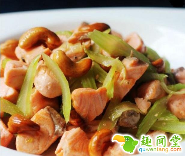 【材料】西芹100克、三文鱼100克、腰果20克、盐1克、蛋清1个、淀粉10毫升