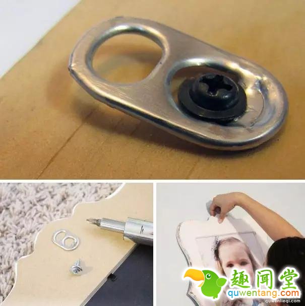简单加工,易拉罐的拉环就成了相框的挂钩。