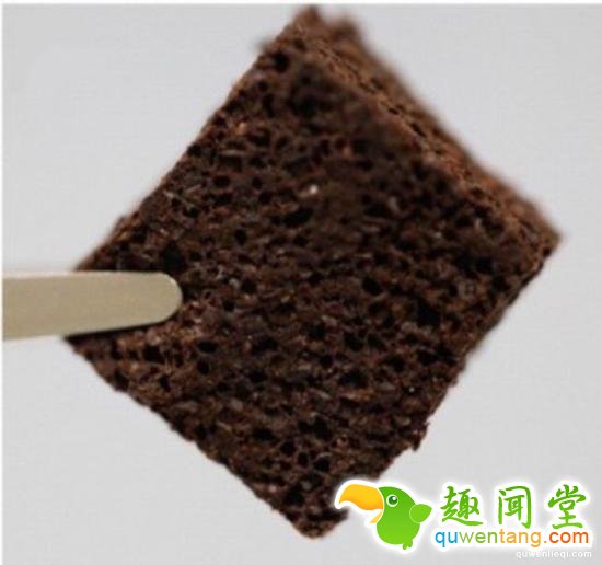 为了方便存储和使用,研究人员往咖啡渣里添加糖和咖啡硅胶,将咖啡渣制成一块块海绵状的块状物质。咖啡渣块被扔进水中后,糖分被溶解后,咖啡渣块将迅速散开,与水中的金属离子相结合。