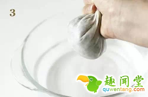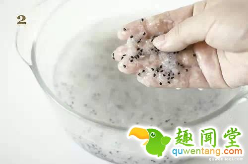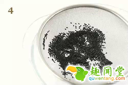 3.再将稀烂的果肉倒入短丝袜,继续搓揉几下,接著就泡水1天,不可泡水两天以上,否则会发芽,隔天再继续搓揉,可使果肉全部挤出,只剩黑色的种子,看起来有点像黑芝麻。