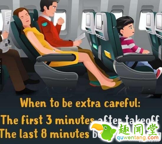 ▼乘飞机时,起飞后3分钟、降落前8分钟需要小心:根据统计,80%的飞机失事案例都是在这段时间里发生的。