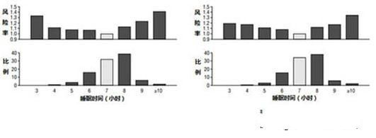 不同睡眠时间对女性(左)和男性(右)死亡风险率的影响。风险率以每晚睡眠7小时的群体死亡率为基准,数值每高0.1则意味着死亡率高10%。