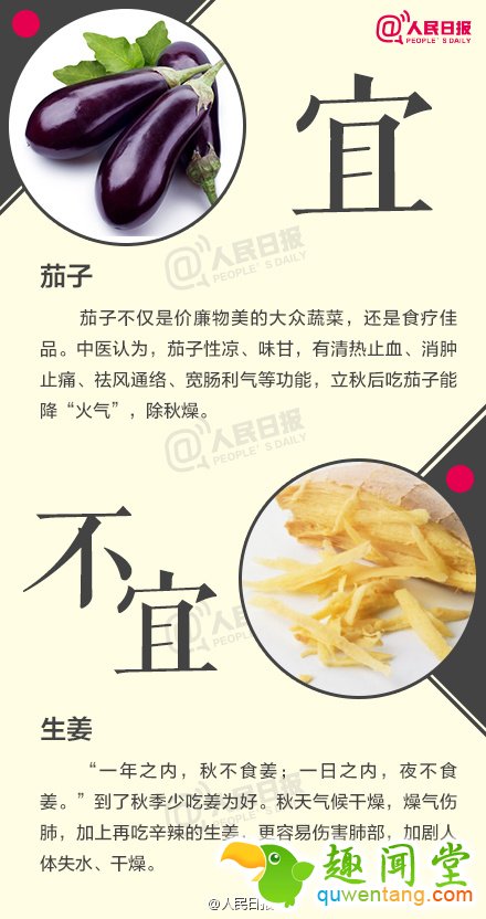 1. 不宜:生姜;宜:茄子;