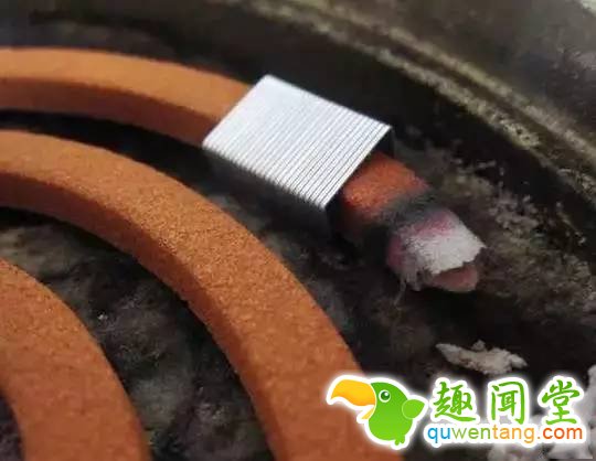 订书针盖住蚊香后,蚊香无法充分接触氧气,最后只能熄灭。知道这个定时灭火装置的原理后,就可以找到很多代替的方法。