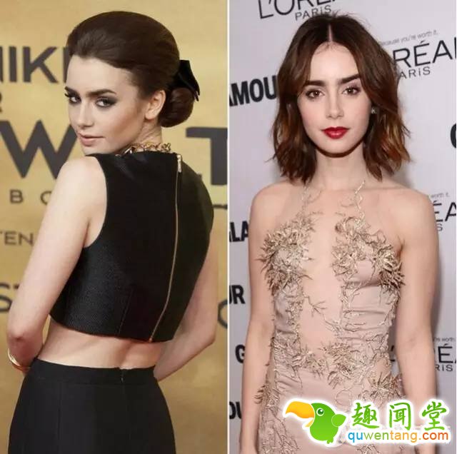 虽然Lily Collins的颜色高,而且还长得年轻甜美,但这种发髻并不适合她,貌似故意将自己打扮成老20岁拍电视剧一样。如果你想扎发髻,发色一定不能这么沉闷,还有就是发髻不要太僵硬,否则就会显得特别老土。中分波波头的Lily Collins,将发梢弄点小心机,看起来会有活力很多,减龄哦!
