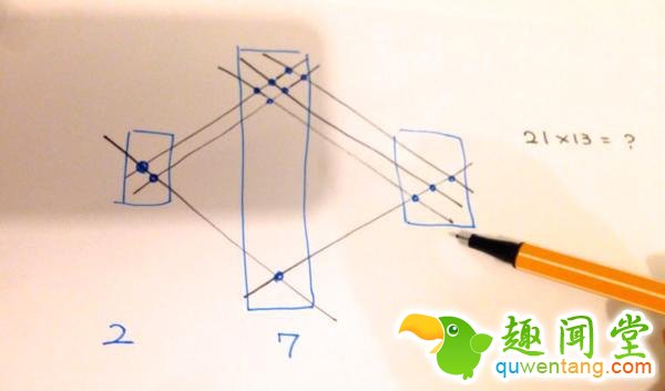 以21×13=为例,左边是“21”,于是画“2”根和“1”根右斜线。