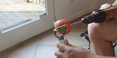 2.将你的苹果放在电钻,并使用蔬菜削皮器会使苹果剥得比以往更快。