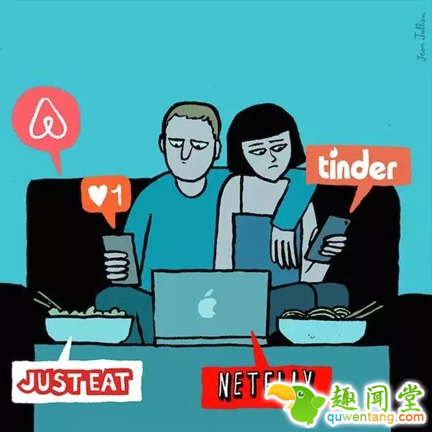 法国艺术家Jean Jullien 想必也深受其害,他特别绘制了一组插画讽刺这事儿??赐昃醯茫胝腋鋈?,不带手机,就聊聊天。