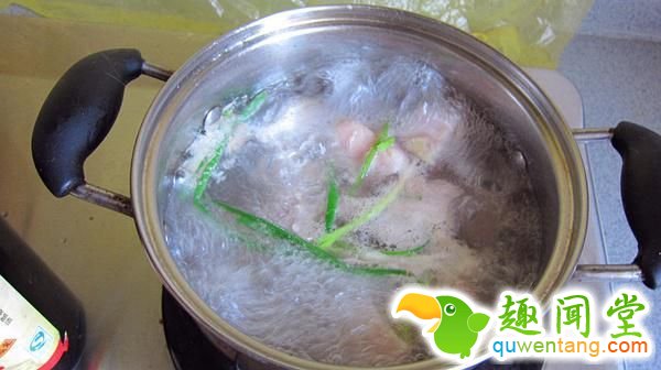 2、锅中放姜丝葱段后,将五花肉放入,同时倒入两勺黄酒去腥去血丝泡沫。3分钟左右捞出冲冷水至冷却。