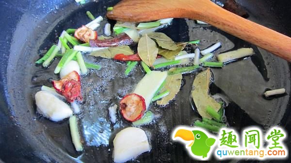 4、刚才的锅不用洗,把油烧热,放入葱,姜,蒜,桂皮,香叶,山楂,爆香。后放入黄酒酱油冰糖炒糖色。改小火。炒到汤颜色变红,气泡由大变小后倒入肉翻炒。裹上酱油和调料。