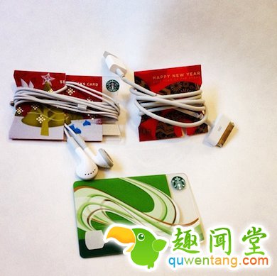 14.用长尾夹做为集线器防止耳机线过长又打结,也可直接夹在包包上。耳机和电源线也可以缠在没用的卡片上,用剪刀稍微剪两下就省下了买绕线器的钱。