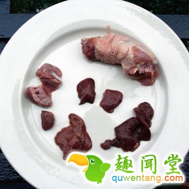 从上到下分别是鸡脖、鸡胗、鸡肾、鸡心和两块鸡肝。