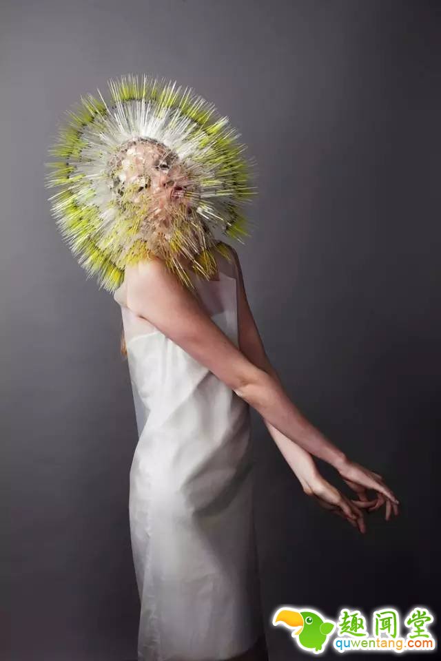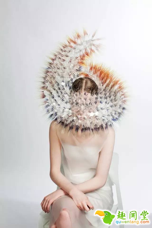 日本设计师Maiko Takeda作品《重返大气层》,利用纤细、轻柔的晶圆聚合物纤维,以及塑料薄膜和压克力等材质制作的帽子,给人营造轻灵飘渺的太空感