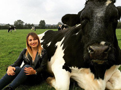 穿着人造革夹克与靴子的科库娃,与奶牛李斯特(Lester)合影。(网页截图) 电子杂志《FEMAIL》记者戴尼科库娃(Deni Kirkova)日前参观了世界上最幸福的动物庇护所-英国休利茨(Hugletts)森林农......