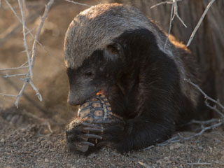 野生动物摄影师Morkel Erasmus在卡拉哈迪跨界公园拍到一只蜜獾捕食乌龟的一幕,可怜的乌龟最终还是没躲过被吃的命运成了蜜獾的盘中餐。 这只蜜獾在捉到乌龟后,便趴在地上开始享用美食,一开始龟壳还稍显坚硬难咬,但蜜獾锋利的牙齿却也不是白长的,它把乌龟紧紧抓在爪中,再对着龟壳狠命一咬,坚硬的龟壳马上就碎了。 这只蜜獾在捉到乌龟后,便趴在地上开始......