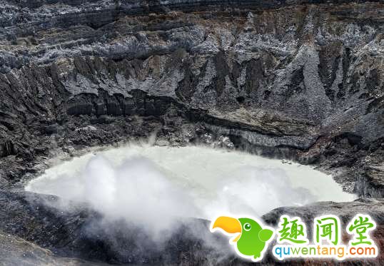 这是在哥斯达黎加的拉古纳卡伦特火山湖,湖的底部有一层厚厚的硫磺。作为世界上酸性最高的湖泊之一,它的PH值几乎为零,因此不支持任何水生生物在湖中生长。